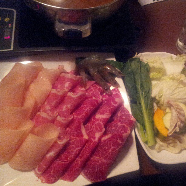 Below is the beef, pork, chicken, and prawn combo shabu shabu ($19.95). Delicious! Great variety and selection! I usually get this with the spicy umakara broth and create a sesame and sriracha dipping sauce with sesame seeds!