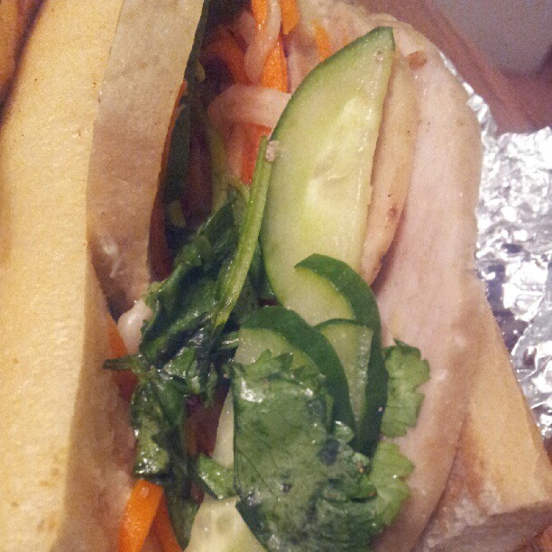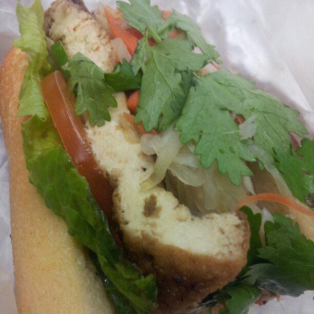 This is the lemongrass tofu banh mi! Deliciously vegetarian, I have come to appreciate dishes that accentuate the natural flavors and pairings of our non-meat eating friends. I really love this banh mi for a variety of reasons, one of which is that it tricks me into eating healthier (if Dr. Harada saw food pics on Facebook or Instagram, he would probably shoot me).